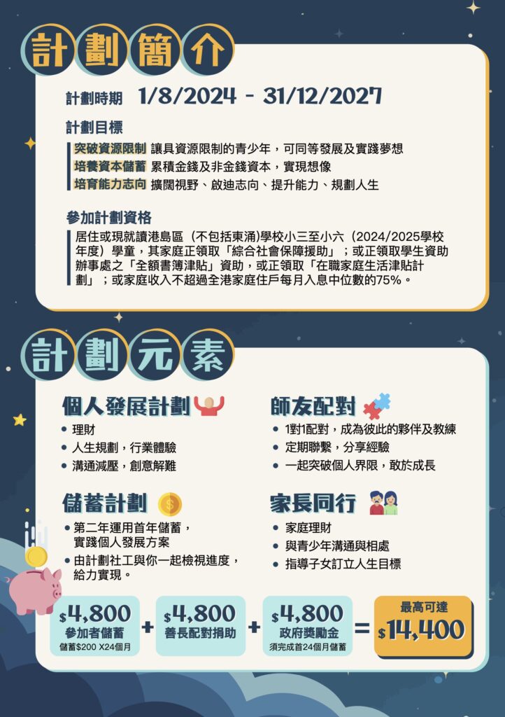 歷史背景:香港明愛青少年及社區服務於2002年開展了「出色小義工獎勵計劃」,旨在培育小學生從小學習「愛你的近人」,懂得關心身邊有需要的人士,並透過實踐行動,傳達天主「愛的信息」及承擔責任。 計劃特色:鼓勵小學生參與課堂外不同形式的義務工作活動,培養他們成為樂於學習、善於溝通、勇於承擔、敢於創新的好孩子。 主要對象:小學四至六年級學生 計劃內容: 義工服務每學年凡參加之小學生其服務時數達30小時或以上,便可獲得「紅獎章」及證書;連續第二年參加之學生其服務時數達30小時或以上,可獲得「橙獎章」及證書;連續第三年參加之學生其服務時數達30小時或以上,可獲得「黃獎章」及證書。 出色小義工頒獎典禮為了鼓勵參與的小學生,本計劃每年均舉辦出色小義工頒獎典禮,頒發嘉許狀、獎章及各服務獎項,嘉許他們為學校及社區作出的貢獻。 https://ycs.caritas.org.hk/wp-content/uploads/2021/ssp_final.mp4https://ycs.caritas.org.hk/wp-content/uploads/2021/tko_final.mp4https://ycs.caritas.org.hk/wp-content/uploads/2021/wy_final.mp4