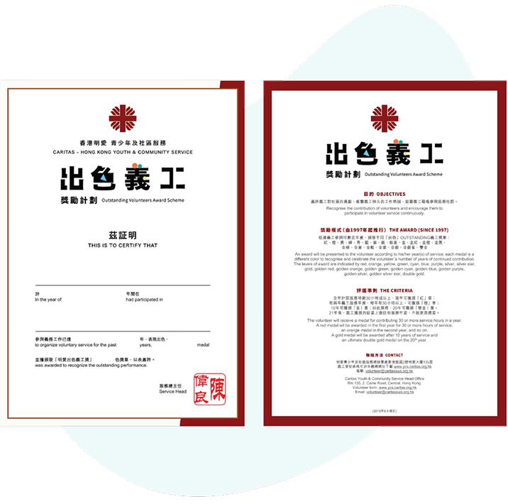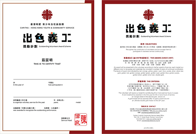 目的:嘉許義工對社區的貢獻,維繫義工持久的工作熱誠,鼓勵義工積極參與服務社群。   獎勵模式 (由1997年起推行) 根據義工參與時數及年資,頒發不同「出色」Outstanding義工獎章:     紅、橙、黃、綠、青、藍、紫、銀、銀星、金     金紅、金橙、金黃、金綠、金青、金藍、金紫、金銀、金銀星、雙金   評選準則: 全年計算服務時數三十小時或以上,首年可獲頒「紅」章; 有兩年義工服務年資,每年有三十小時以上,可獲頒「橙」章; 十年可獲頒「金」章;如此類推,二十年可獲頒「雙金」章。 二十一年後,義工獲頒的証書上會註明服務年資,不設更高獎章。   電郵:  volunteer@caritassws.org.hk
